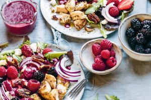 Genovesallad med rostade rödbetor, fetaost, lufttorkad skinka, tomater och honungsvinegrette